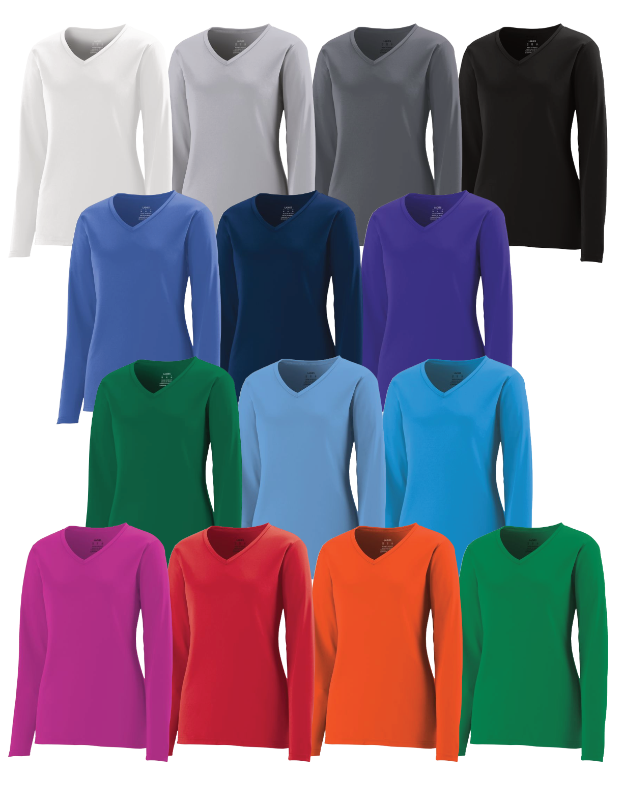 The tee features a ladies' fit, a non-branded tagless label, a self-fabric V-neck collar, and set-in sleeves. The double-needle hemmed set-in sleeves and bottom enhance the durability of the garment. This long-sleeve tee is ideal for layering during cooler weather workouts or as a standalone top in milder conditions.